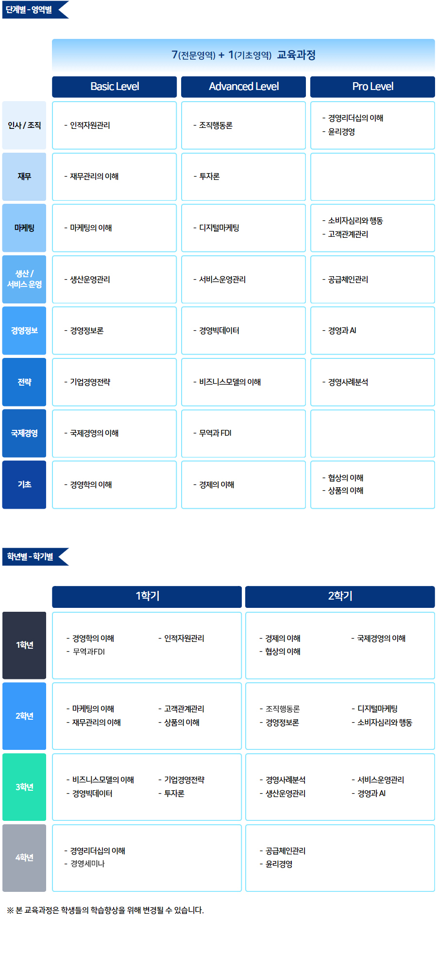 | 1학년 | 1학기 | 경영학의 이해, 조직행동론, 인적자원관리 |