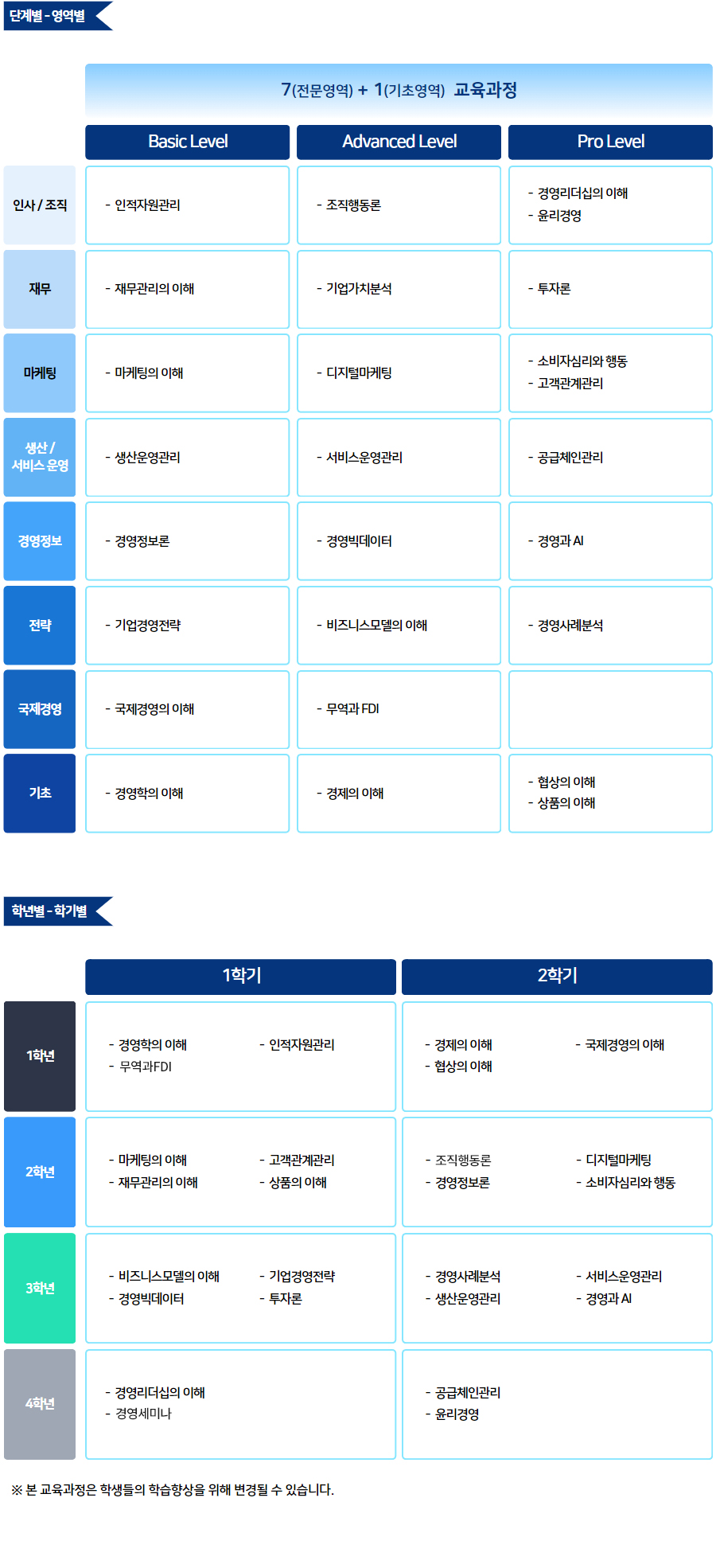| 1학년 | 1학기 | 경영학의 이해, 조직행동론, 인적자원관리 |
